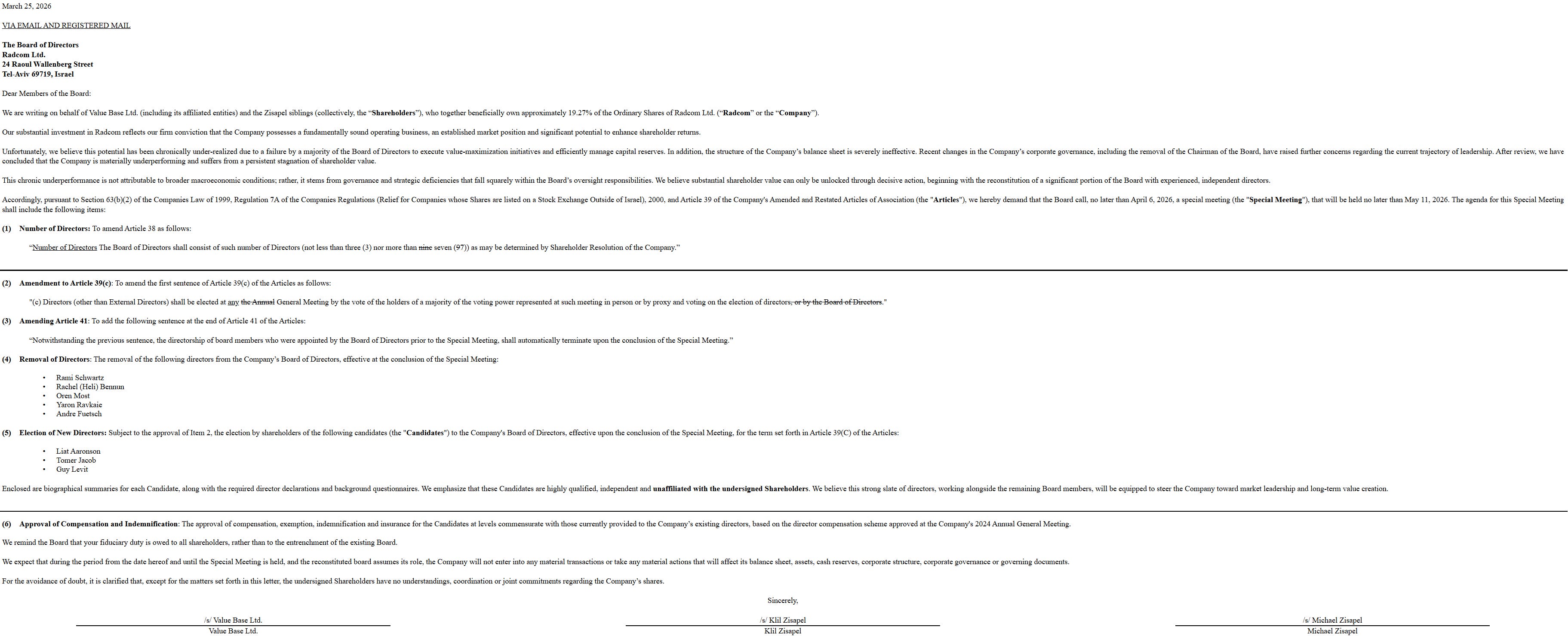 A week later, on March 26, the Zisapel siblings and Value Base filed 13D filings in which they stated that they were part of a group, and sent the following letter to the board of director: